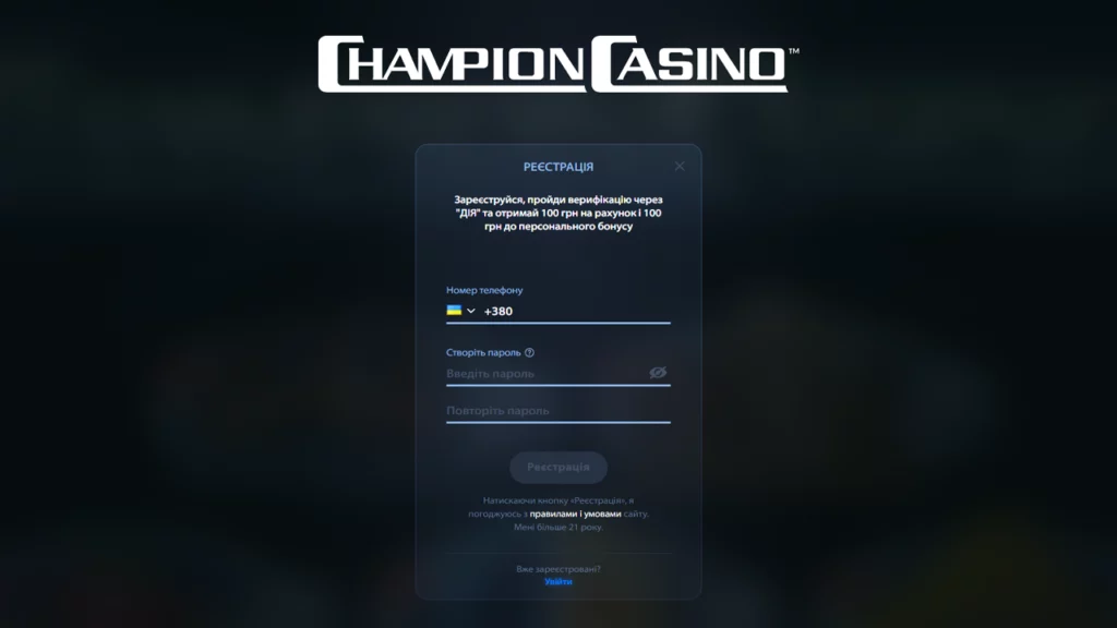 Коли профіль активовано, гравець може виконати вхід в Сhampion за кілька секунд. Для цього достатньо натиснути “Увійти” на головній сторінці та ввести логін і пароль. Процес настільки простий, що навіть новачки справляються без підказок.